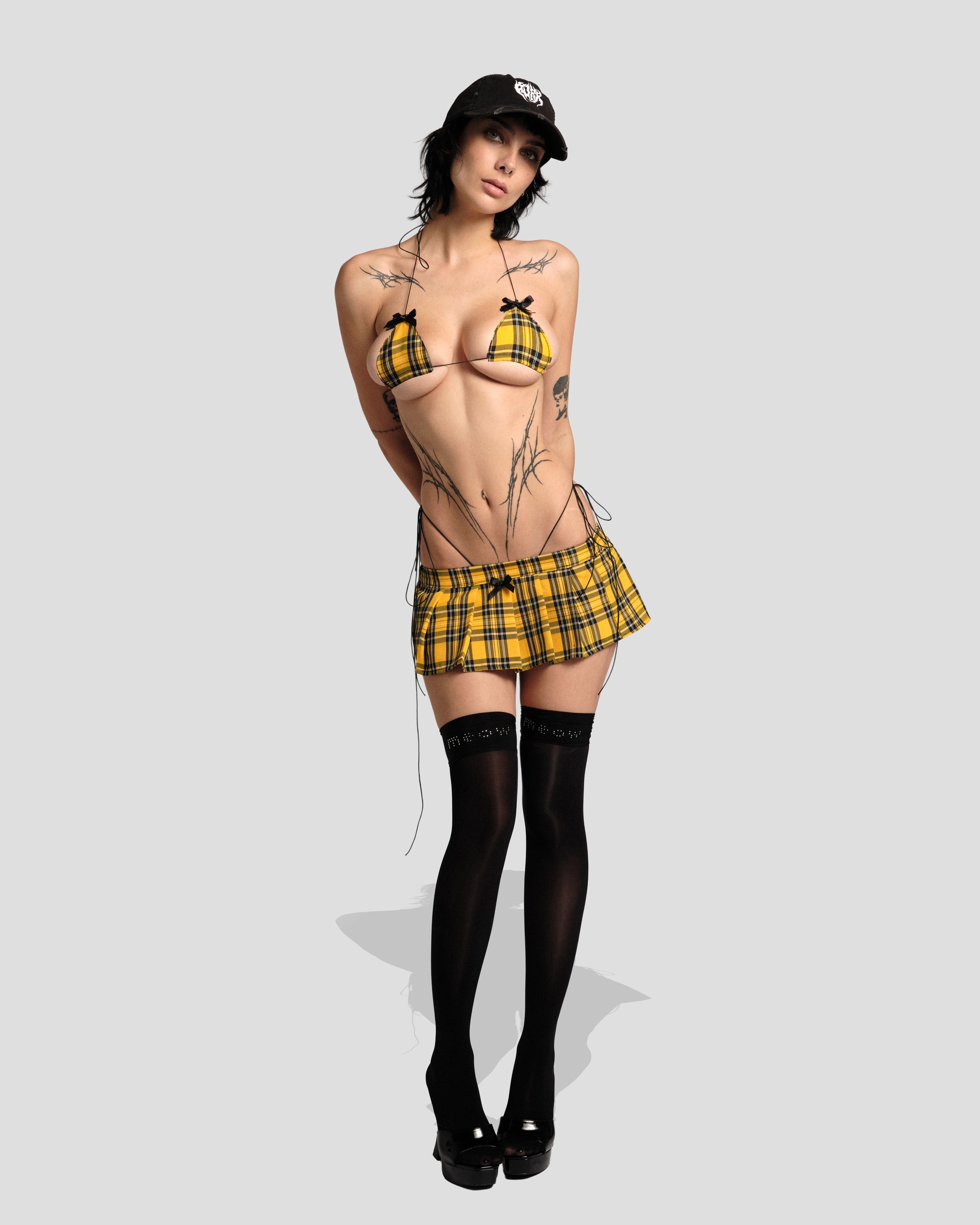 The full picture. The Kitten Play Set in Clueless Plaid is the complete Kitten collection in one — micro triangle top, matching thong, and pleated micro skirt, all in our bold yellow and black check. Tied together literally and figuratively with black cord ties and black bow details throughout. Sweet. Unhinged. Completely kitten-coded.