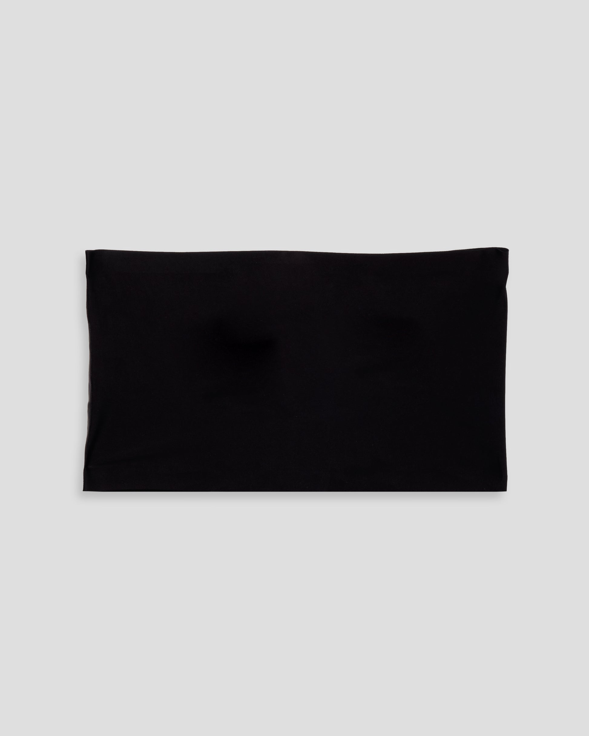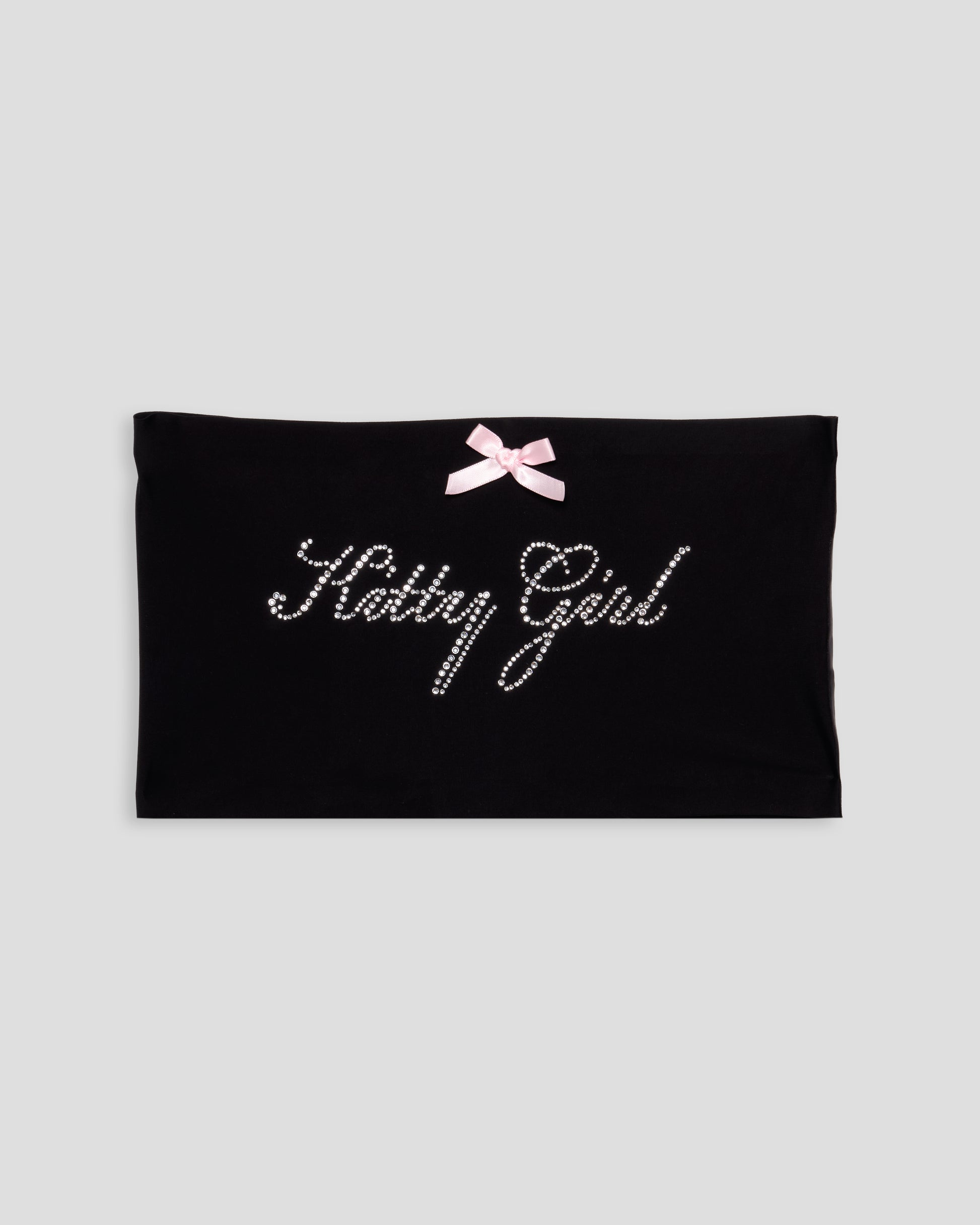 The Kitty Girl Rhinestone Bandeau Top is a sleek black stretch bandeau with a rhinestone "Kitty Girl" script across the front and a dainty pink satin bow at center. Thin, second-skin fit with serious attitude.