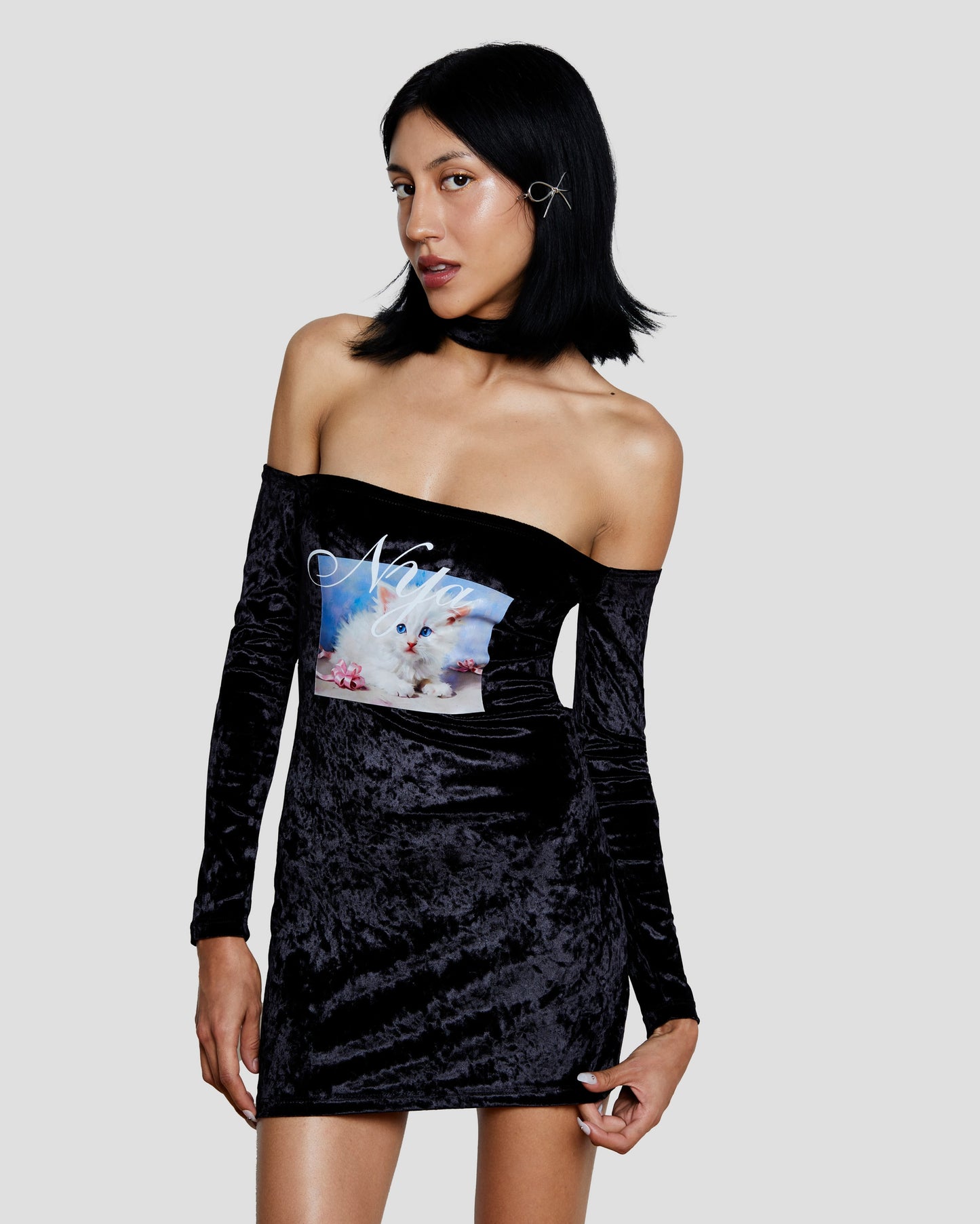 Step into purrfection with the 𝒩𝓎𝒶’𝓈 𝐿𝒾𝓉𝓉𝓁𝑒 𝐻𝑒𝒶𝓋𝑒𝓃𝓁𝓎 𝐵𝓁𝒶𝒸𝓀 𝒟𝓇𝑒𝓈𝓈. This luxe velvet mini-dress, a dreamy Bunny Holiday collaboration, features a heavenly kitten print front and center, topped with the playful “Nya” script. Designed with an off-shoulder silhouette and long sleeves, it’s a sultry mix of sweet and sassy. Perfect for nights out, holiday parties, or making a statement anywhere, this dress is your ultimate flirty-meets-fierce look.
