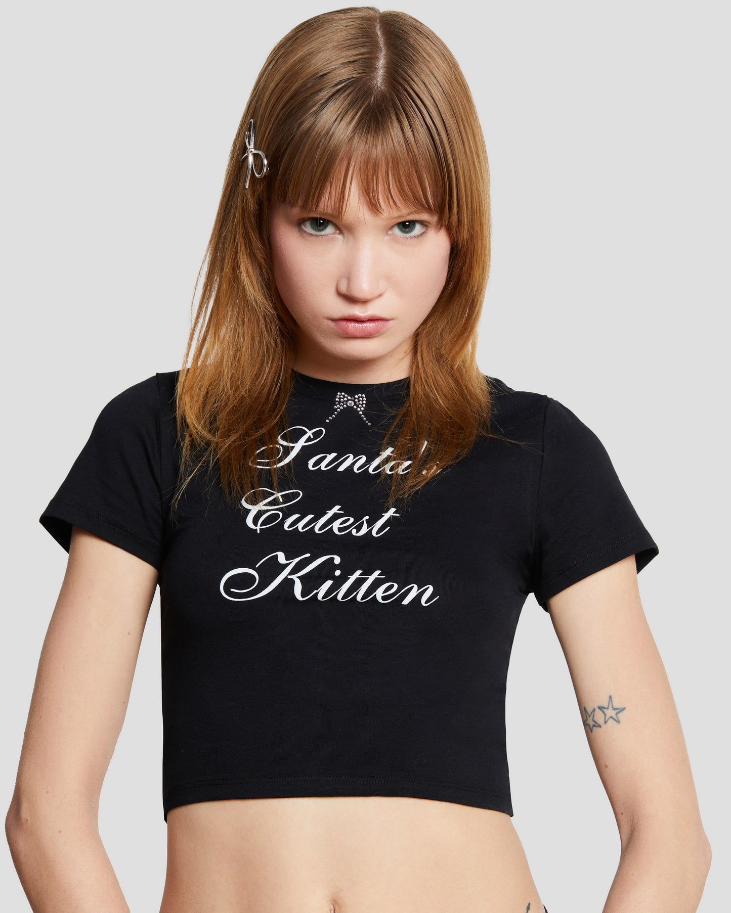 Flirt through the festive season with the ๐ฎ๐ถ๐๐๐ถโ๐ ๐๐๐๐๐๐ ๐ฆ๐พ๐๐๐๐ ๐๐๐ธ๐ . Perfectly playful, this black crop top brings sass to Santaโs list with elegant white script and a rhinestone bow accent that meowwwss irresistible charm. Pair it with cozy sweats or a glam mini skirt to take this versatile cutie from lounging to late-night mischief.