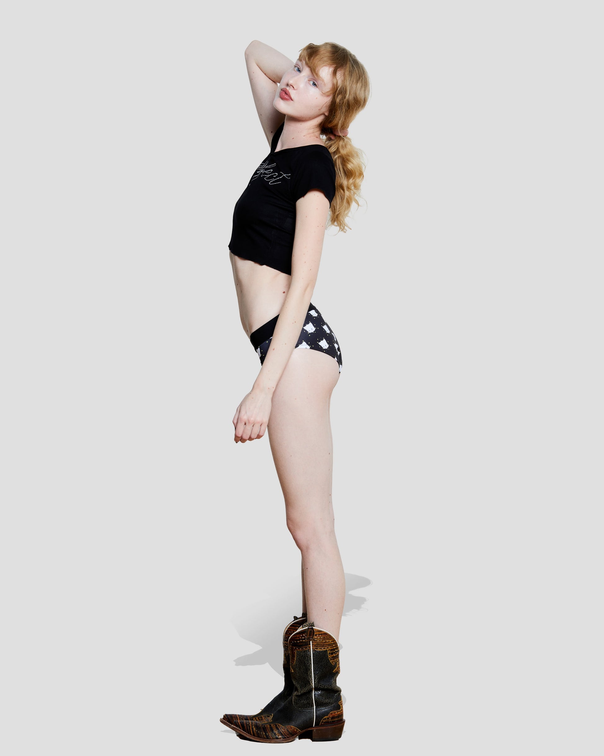 The Kitten Galaxy Panties feature an all-over CNS-original print of white kitten heads and tiny yellow stars on a sleek black microfiber base. Designed with a comfy fixed waistband and soft-stretch fit, they’re breathable enough for everyday wear but cute enough to take for a dip.