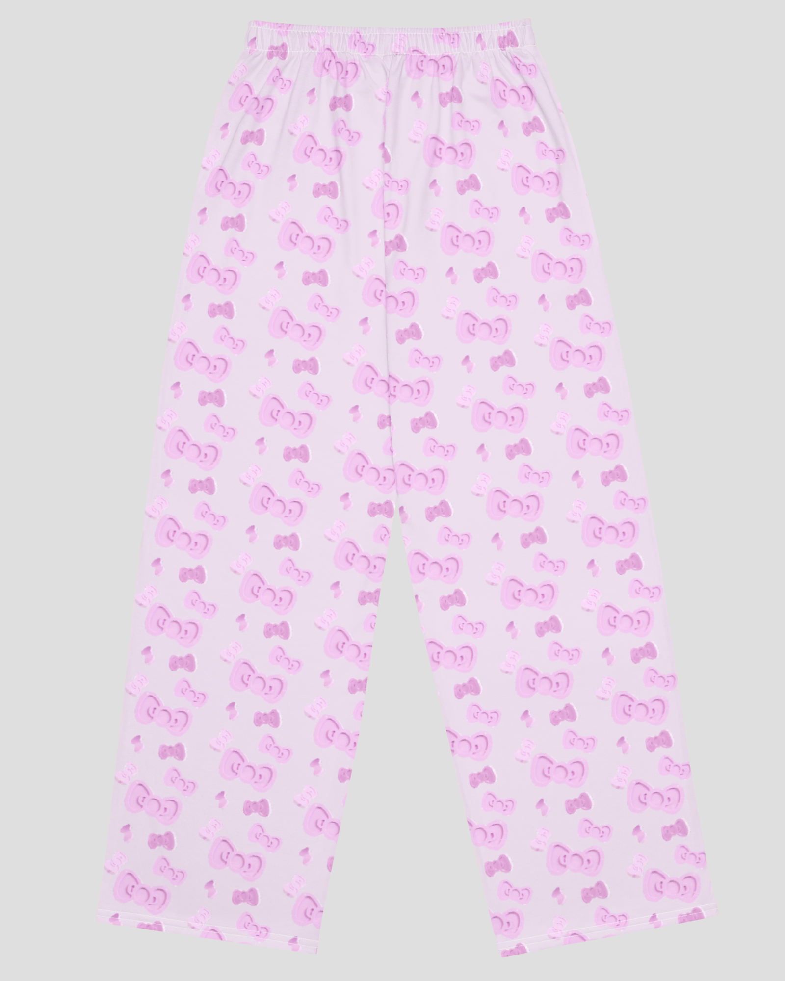 The Saddle Up Unisex Wide Leg Pant brings bedtime rodeo vibes to your everyday loungewear rotation. Printed all over with pink bows, glitter stars, and a big-eyed cowboy kitten, these pants were made for galloping from couch to bodega in style.